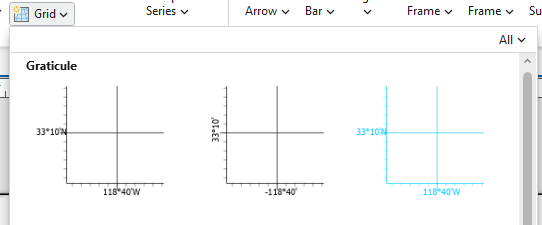 It can sometimes be easy to forget that the people looking at your maps are not as familiar with the data, area, and topic as you are. People from all over the world map end up looking at your map, so it is always important to make sure everyone – regardless of their background knowledge – is able to interpret and read your map. For the example shown in this document so far, people from Eastern Canada may recognize the Hudson’s Bay area in the map, yet many of us may be initially confused as to where this study area is located. There are a few ways by which we can make this easier for our map-viewer to interpret. On of these ways is by inserting grid-lines which show lat/lon lines across our map. To do so, navigate to the ‘Grid’ option in the Insert bar for your layout, and select one of the grid options.