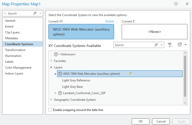 Tip: Using the search bar can be the fastest way to find a projection you’re looking for, but the layers drop-down will have all the projections of any layers on your map already ready for easy selection. You can also save your most common projections under Favorites if you find yourself using the same projections over and over.