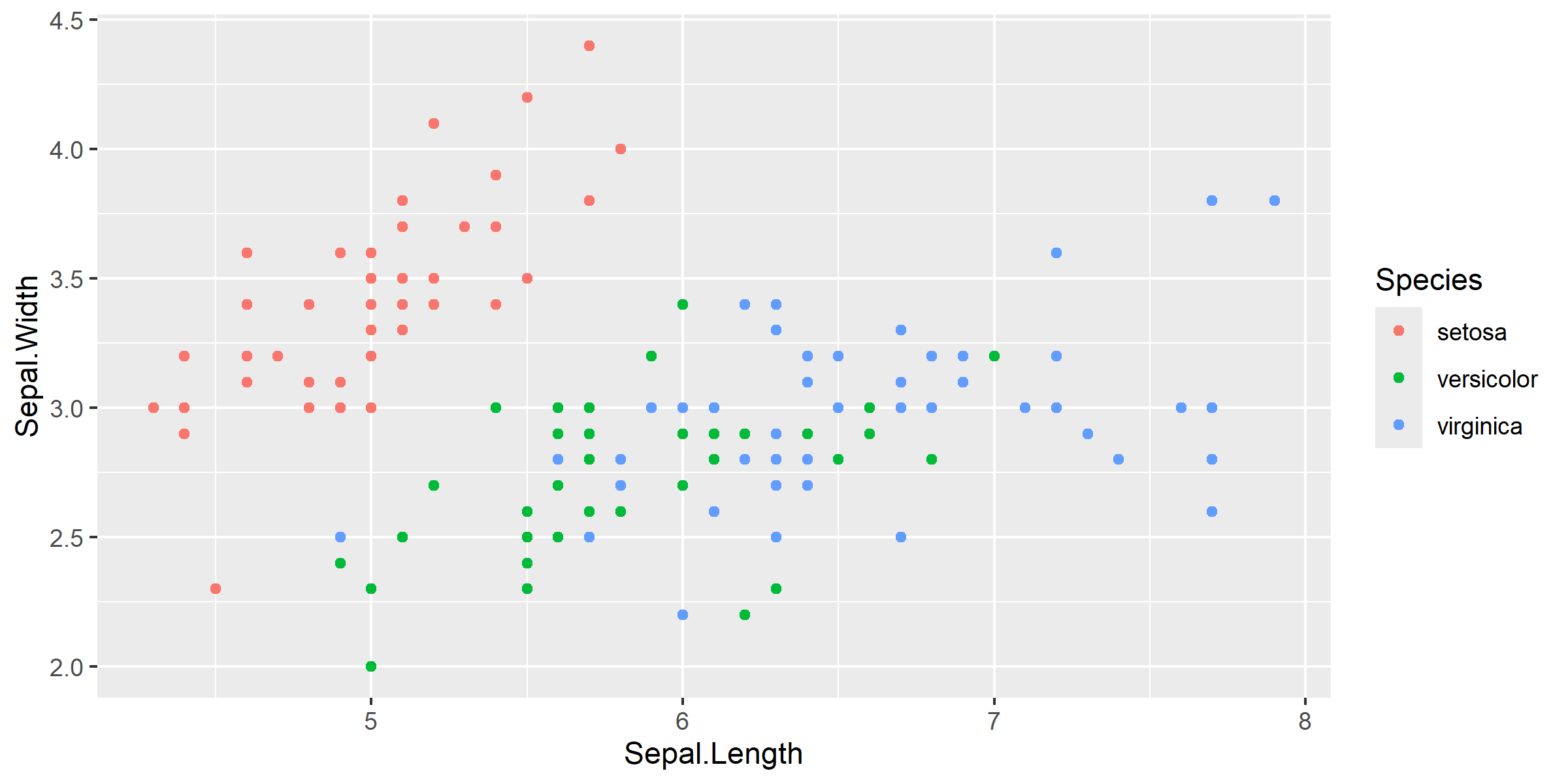 ggplot(data = iris, aes(x = Sepal.Length, y = Sepal.Width)) +geom_point()