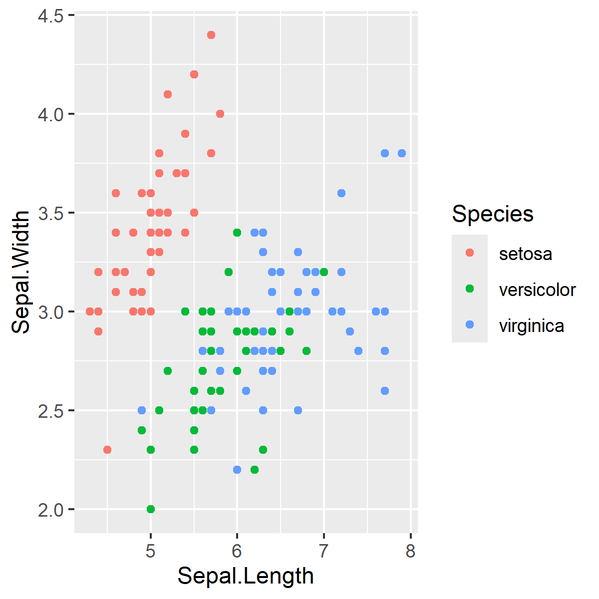 This gives each point a colour that corresponds to one of the unique Species classes. If you want to group the data by Species and assign this to unique colours, the colour argument will go in aes() because we are mapping this variable to an aesthetic. As an aside, we can also set the colour to be a static Value.