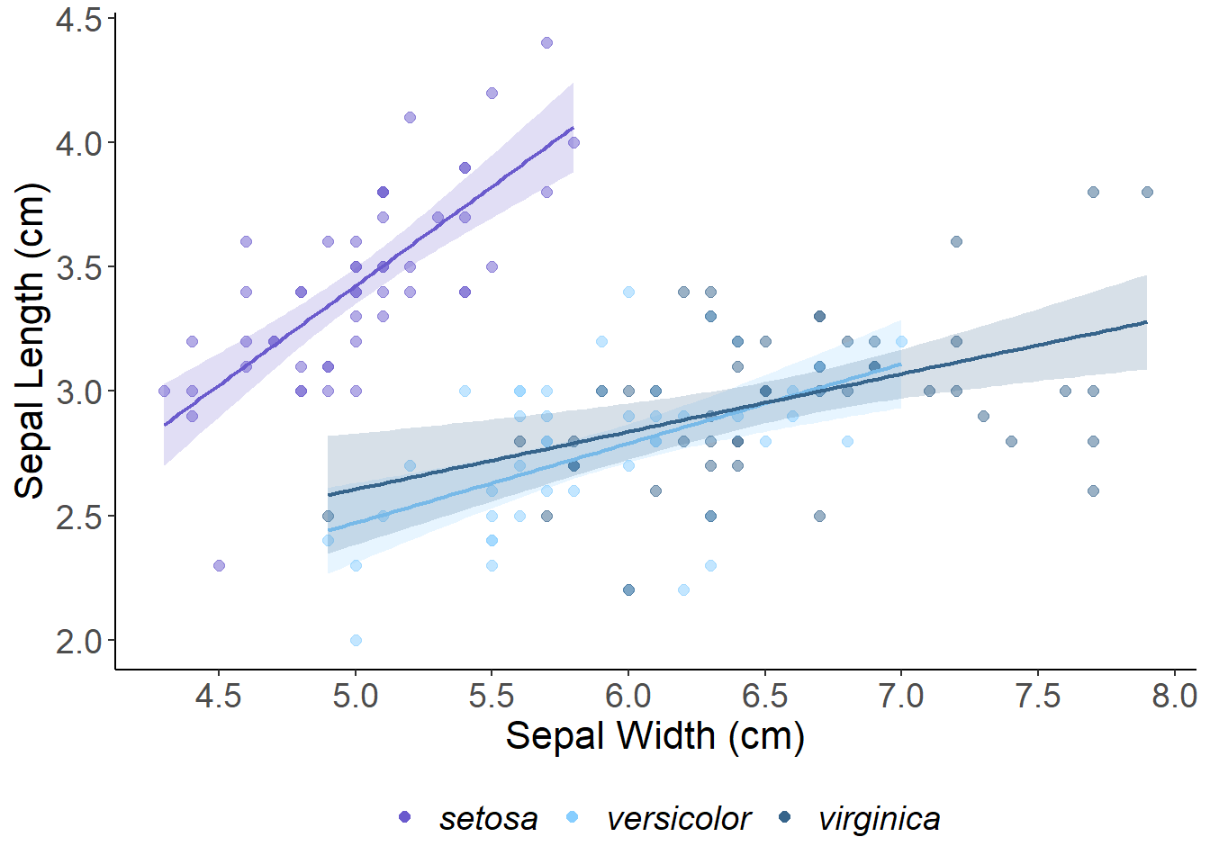 ggplot(aes(x = Sepal.Length, y = Sepal.Width, color = Species, fill = Species), data = iris) +geom_point(alpha =0.5, size =2) +scale_color_manual(name ="", values =c("slateblue", "skyblue1", "steelblue4")) +# manually set the point colors and remove "Species" from the legend scale_fill_manual(name ="", values =c("slateblue", "skyblue1", "steelblue4")) +# the standard error around the lines is controlled by the "fill" scale_x_continuous(breaks =seq(1, 8, by =0.5))+# set the x-axis breakpointsxlab("Sepal Width (cm)") +ylab("Sepal Length (cm)") +geom_smooth(alpha =0.2, linewidth =0.75, method ="lm", show.legend =FALSE)+# adjust the transparency and size of the lines and remove the fill from the legendtheme_classic() +guides(colour =guide_legend(override.aes =list(alpha =1))) +# override the point transparency in the legendtheme(axis.text =element_text(size =14),axis.title =element_text(size =16),legend.text =element_text(size =14, face ="italic"), # add italics for species names legend.title =element_text(size =16),legend.position ="bottom")