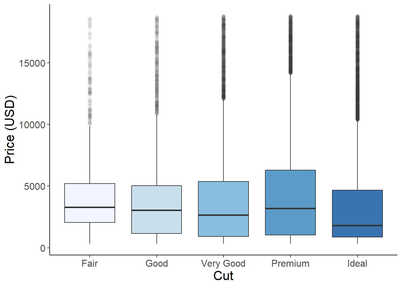 ggplot(aes(x = cut, y = price, fill = cut), data = diamonds) +geom_boxplot(alpha =0.8, outlier.alpha =0.05, outlier.size =2)+# adjust the size and transparency of the outliers - we could also remove them completely using alpha = 0 scale_fill_brewer(palette ="Blues")+# use "brewer" for set color palettes xlab("Cut")+ylab("Price (USD)")+theme_classic()+theme(axis.text =element_text(size =12),axis.title =element_text(size =16),legend.position ="none")