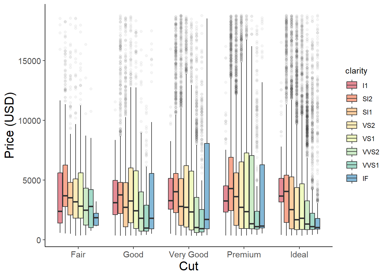 ggplot(aes(x = cut, y = price, fill = clarity), data = diamonds) +# use the fill argument to group by a second categorygeom_boxplot(alpha =0.6, outlier.alpha =0.05) +scale_fill_brewer(palette ="Spectral") +xlab("Cut") +ylab("Price (USD)") +theme_classic() +theme(axis.text =element_text(size =11),axis.title =element_text(size =16),legend.position ="right")