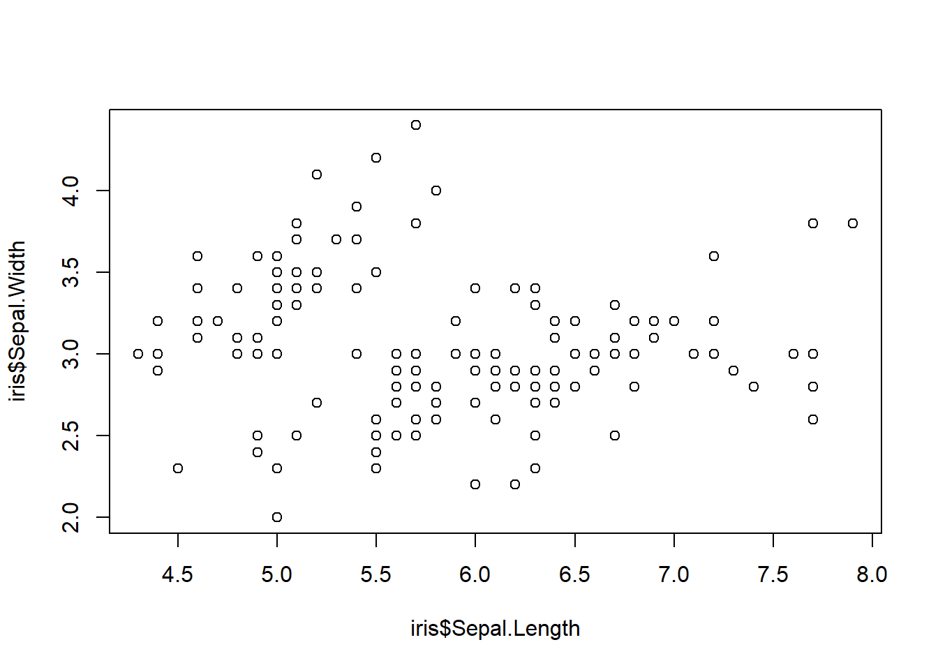 plot(x = iris$Sepal.Length, y = iris$Sepal.Width)