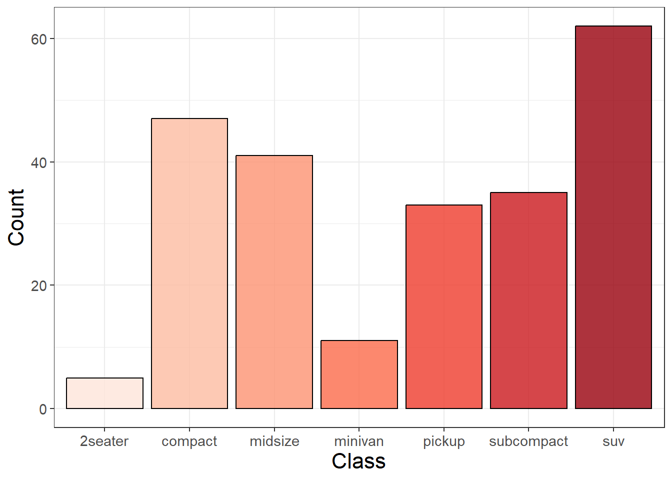 ggplot(aes(x = class, fill = class), data = mpg)+geom_bar(alpha =0.8, color ="black")+scale_fill_brewer(palette ='Reds')+xlab("Class")+ylab("Count")+theme_bw()+theme(legend.position ="none")+theme(axis.text =element_text(size =11),axis.title =element_text(size =16))