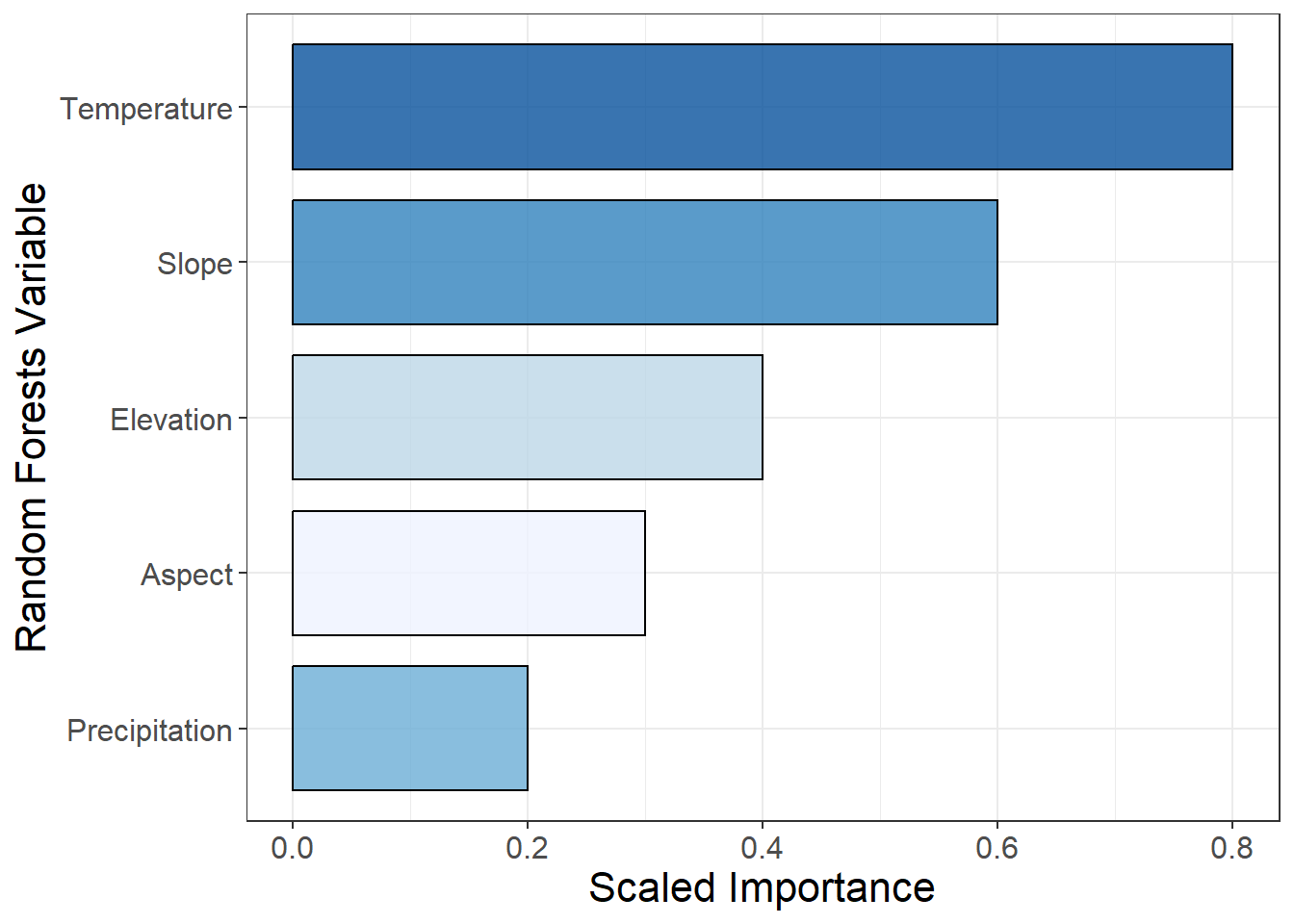 # make some sample variable importance data dt =data.frame(Variable =c("Temperature", "Precipitation", "Slope", "Aspect", "Elevation"), Importance =c(0.8, 0.2, 0.6, 0.3, 0.4))ggplot(aes(x =reorder(Variable, Importance), y = Importance, fill = Variable), data = dt)+geom_bar(stat ="identity", color ="black", alpha =0.8, width =0.8)+coord_flip()+scale_fill_brewer(palette ="Blues")+ylab("Scaled Importance")+xlab("Random Forests Variable")+theme_bw()+theme(axis.text =element_text(size =12),axis.title =element_text(size =16),legend.position ="none")