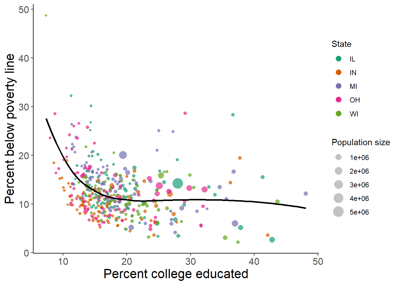 This plot is looking pretty good! But if we are plotting multiple groups of data we might want to consider using a multi-panel plot for each group. This is easy to set up using on of our key ggplot elements: facets. Faceting generates small multiples each showing a different subset of the data. facet_wrap() is the most common function used to implement facets because of its flexibility. facet_wrap() makes a long ribbon of panels and wraps it into 2d, splitting the data by the variable that you specify. Some of the key arguments include: