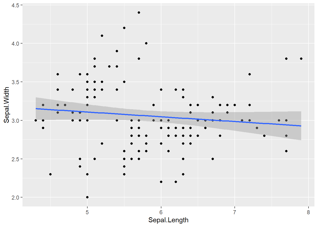 ggplot(data = iris, aes(x = Sepal.Length, y = Sepal.Width)) +# specify data and aesthetic mapping to ggplot geom_point() +# add point geometry layer geom_smooth(formula = y ~ x, method ="lm") # fit a linear model