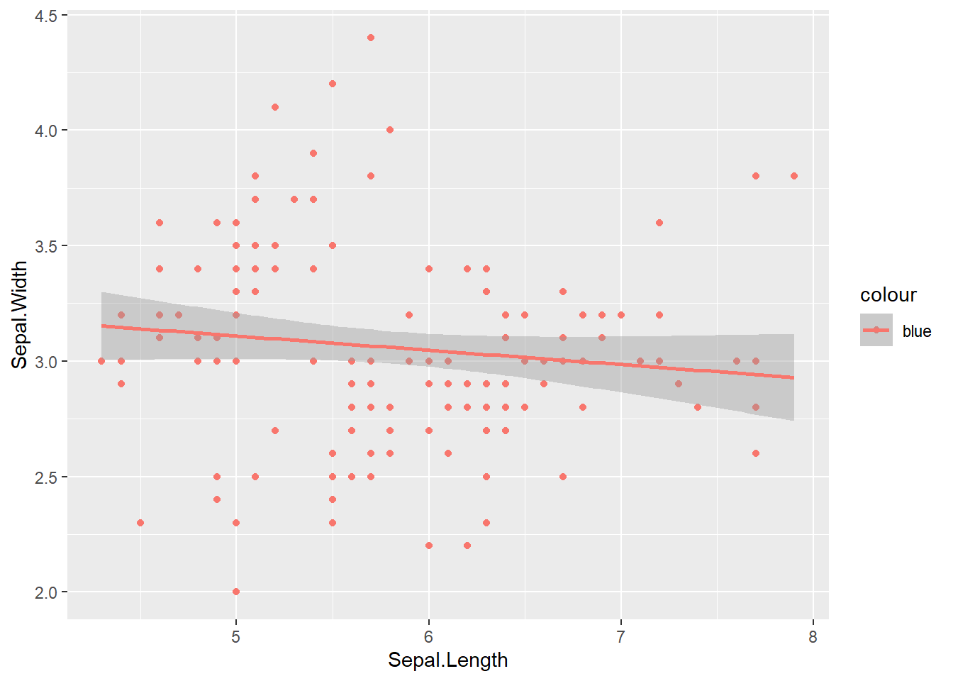 ggplot(data = iris, aes(x = Sepal.Length, y = Sepal.Width, colour ="blue")) +# The color parameter is still scaled since it is inside aes()geom_point() +# aesthetics are "inherited" from the first ggplot() line geom_smooth(formula = y ~ x, method ="lm")