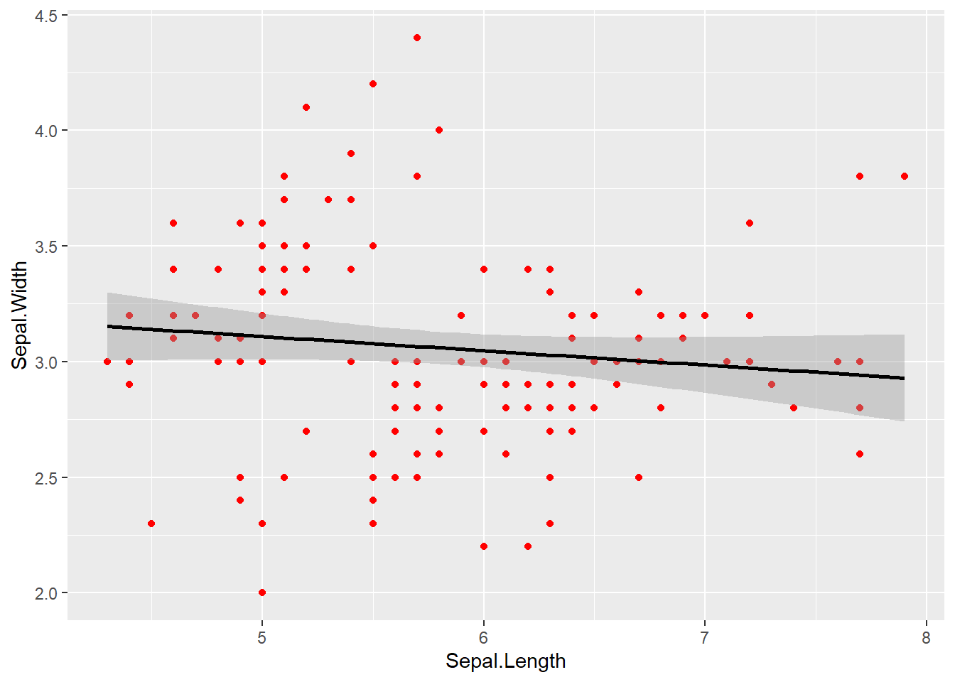 ggplot(data = iris, aes(x = Sepal.Length, y = Sepal.Width)) +# The color parameter is now outside of aes() so "colour" is set to a fixed valuegeom_point(colour ="red") +# aesthetics are "inherited" from the first ggplot() line geom_smooth(formula = y ~ x, method ="lm", color ="black")
