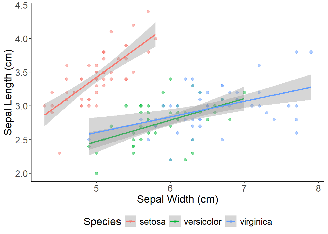 ggplot(data = iris, aes(x = Sepal.Length, y = Sepal.Width, color = Species)) +geom_point(alpha =0.5, size =2)+## adjust point size and transparency xlab("Sepal Width (cm)") +## set x and y labels ylab("Sepal Length (cm)") +geom_smooth(method ="lm") +theme_classic() +## a nice theme that removes the grey background and graticulestheme(axis.text =element_text(size =14), ## font size of legend/axis axis.title =element_text(size =16),legend.text =element_text(size =14),legend.title =element_text(size =16),legend.position ="bottom")